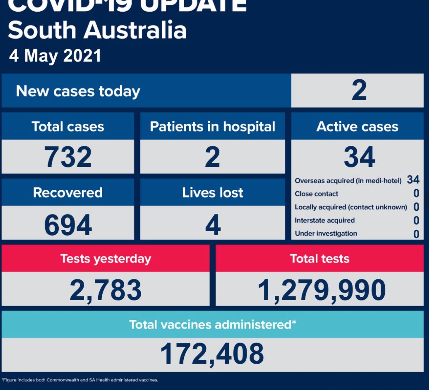 2021年5月4日,星期二,南澳大利亚州新冠疫情病例更新情况如下: 过去24小时内,南澳新增确诊病例2例,均为海外输入病例,无本土新增。 活跃病例34例,仍有2例患者在医院中恢复和治疗。 累计确诊病例732例, ...