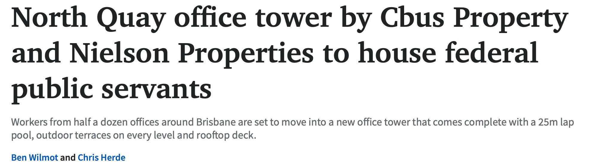由Cbus地产公司和Nielson地产公司联合开发的价值6亿澳元的办公大楼被广泛看好,将成为为布里斯班容纳多达4000名联邦公务员的办公场所。 开发商表示,该大厦将是澳大利亚第一个为租户提供整体工作和生活方式的 ...