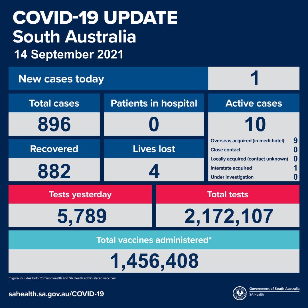 2021年9月14日,星期二,南澳新冠病例情况更新如下: 新增确诊病例1例!为海外输入病例! 活跃病例10例,无患者在医院中康复与治疗。 共康复882例,死亡4例。 昨日共进行检测5789次,累计检测2,172,107次 ...