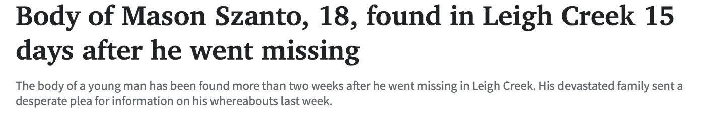 南澳两周前失踪的一名男子的尸体已被发现。 警方认为Szanto可能试图搭车回Port Augusta West。 他担心的姐姐上周说,一定有人掌握了更多关于她弟弟下落的信息。 "在这样一个小镇上,谁会就这样从 ...