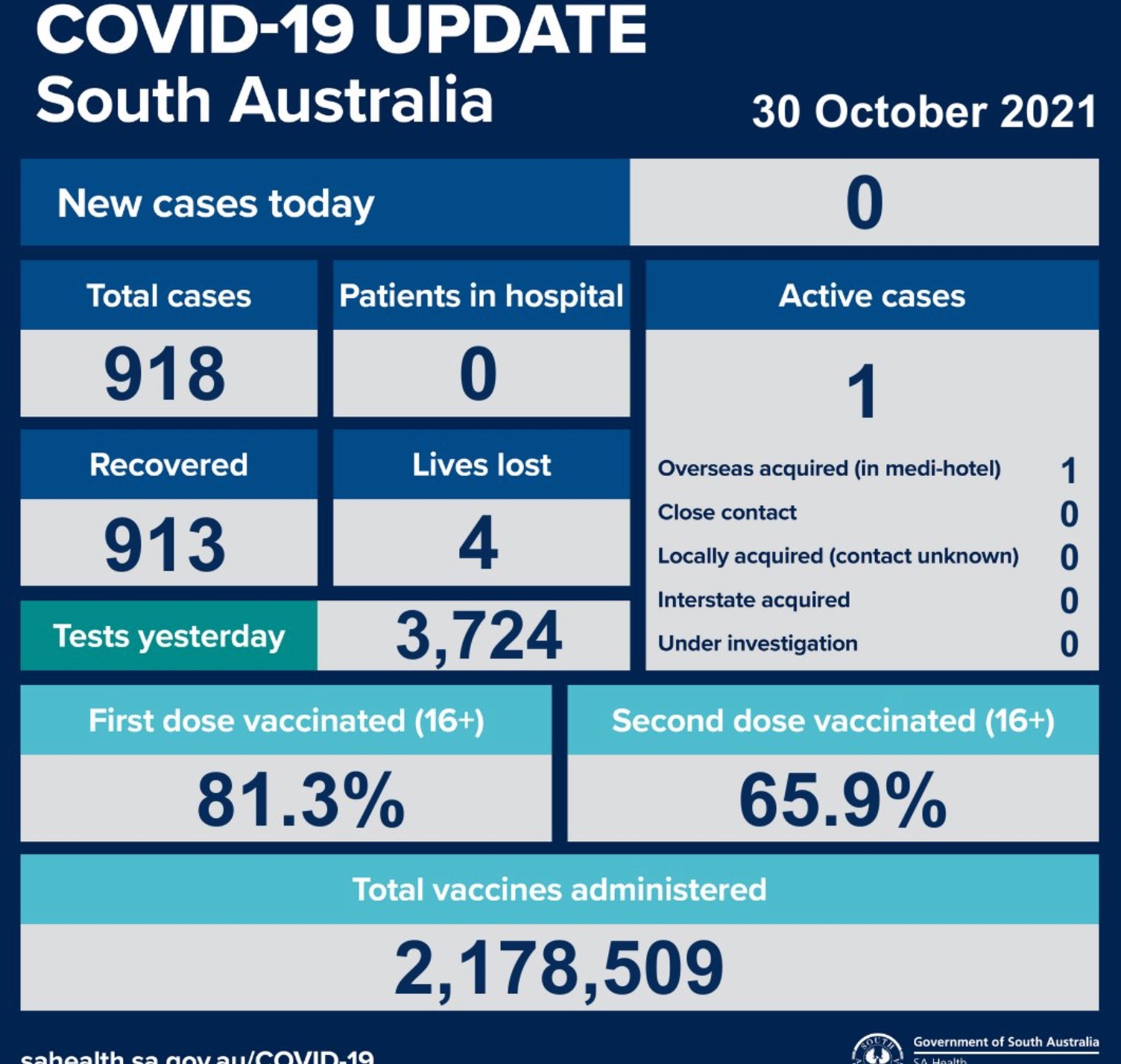 2021年10月30日,星期六,南澳新冠病例情况更新如下: 无新增确诊病例; 活跃病例1例,无患者在医院中康复与治疗。 共康复913例,死亡4例。 昨日共进行检测3724次。 第一针疫苗接种率为81.3%,第二针疫苗接种 ...