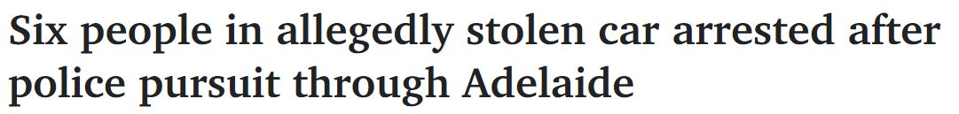 六个人挤在一辆被盗的汽车里,据称在阿德莱德南郊被警察疯狂追捕后被逮捕。 司机是一名无固定居所的男子,31岁,被指控参与警方追捕、非法使用机动车、无证驾驶和酒后驾驶,因为他的酒精含量为0.138,几乎是 ...