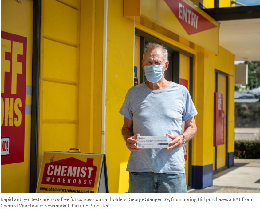 尽管人们担心没有足够的免费快速抗原检测给优惠卡持有人,但许多药店都有充足的库存。 89岁的George Stanger和他的妻子来自Spring Hill,今天早上从Chemist Warehouse领取了两个测试。 他说,他的女儿一直 ...