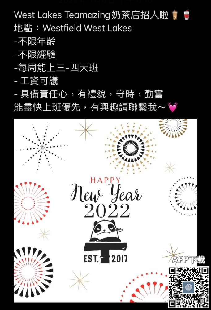 West Lakes Teamazing奶茶店招人啦 地點:Westfield West Lakes -不限年齡 -不限經驗 -每周能上三-四天班 - 工資可議 - 具備責任心,有禮貌,守時,勤奮 能盡快上班優先,有興趣請聯繫我~ VX: HelenLam520 請備 ...