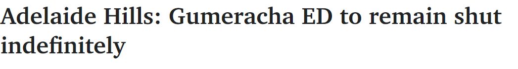 在未能吸引到资金和政府支持后,Adelaide Hills一个急诊科将继续无限期地关闭。 最近的急诊科在Modbury Hospital,距离西部和Mount Barker27公里,距离南部35公里,经过多风和危险的道路。 "我们将继 ...