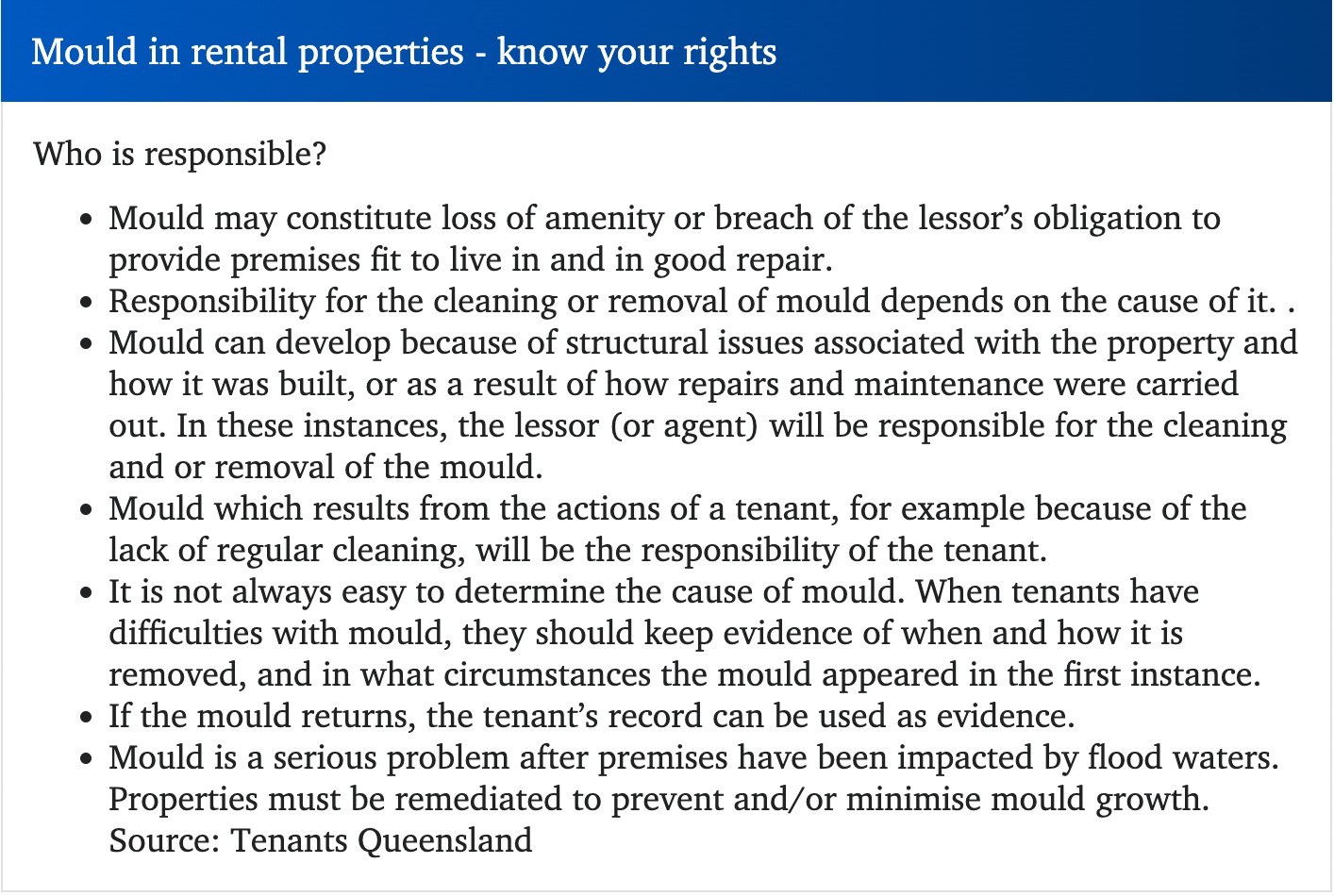 昆州东南部的租户被迫自己清理霉菌,房屋空置率很低,他们担心抱怨会带来坏影响,只能忍受霉菌发酵。 然而,她说,确保房产清洁和维护是租户的责任。 她说,霉菌会导致双方在谁负责的问题上产生争议。 “如 ...