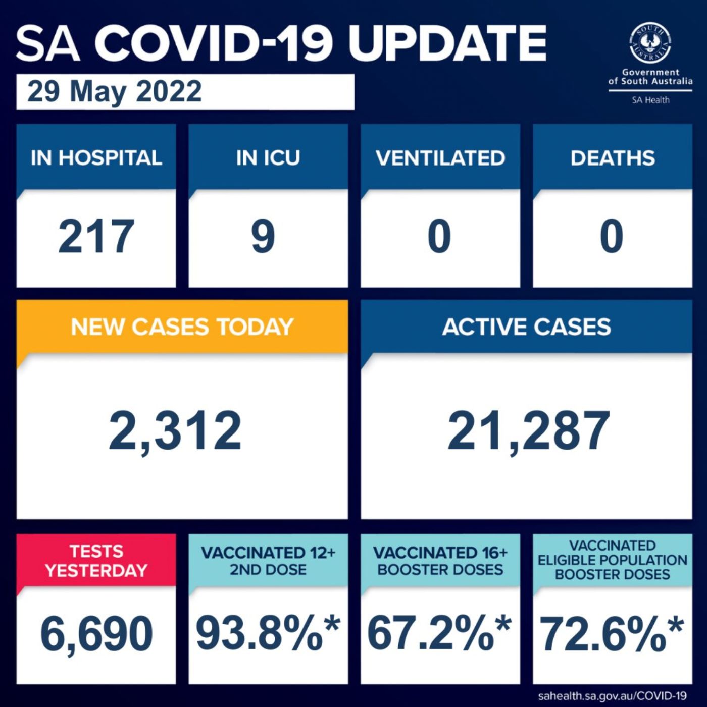 在过去的24小时里,南澳新增2312例,无人死亡! 目前南澳有21,287个活跃病例。 目前南澳有217名COVID-19患者住院,其中9人在重症监护室。 在住院患者中,有102人已接种三针或四针疫苗,93人未接种或接种了 ...