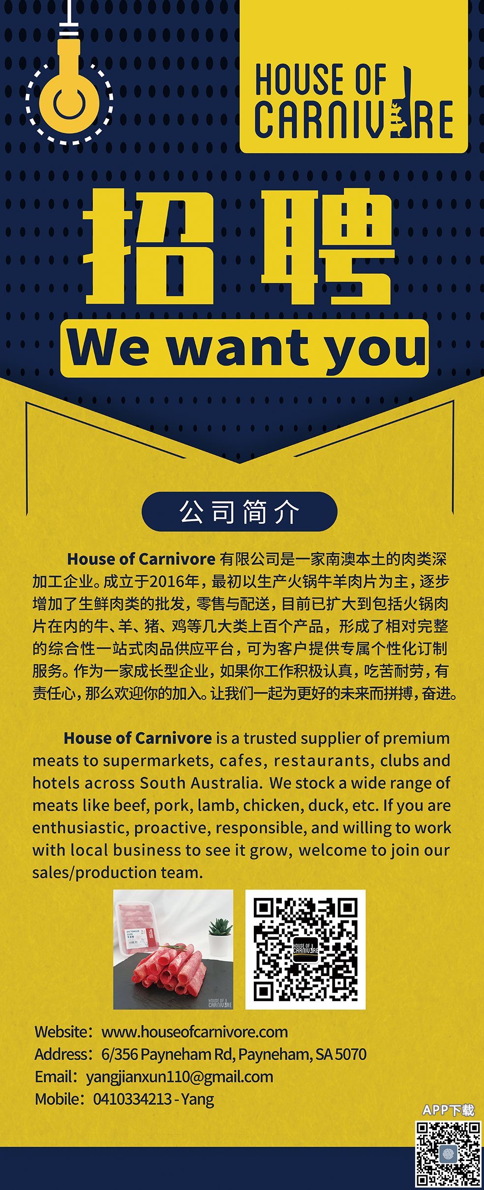 House of Carnivore 是一家南澳本土的肉食品供应商,成立于2016年。作为成长型的企业,有专业的供应平台以及稳定的客户源。由于业务不断扩大,新一轮的招聘开始喽如果你工作积极认真,吃苦耐劳,有责任心,那么欢迎 ...