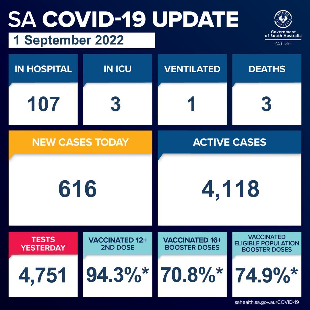在过去的24小时里,南澳新增616例,3人死亡。 目前南澳有4,118个活跃病例。 南澳卫生部证实,有3人死亡,是一名40多岁的妇女、一名70多岁的男性和一名80多岁的男性。 目前南澳有107名COVID-19患者住院,其 ...