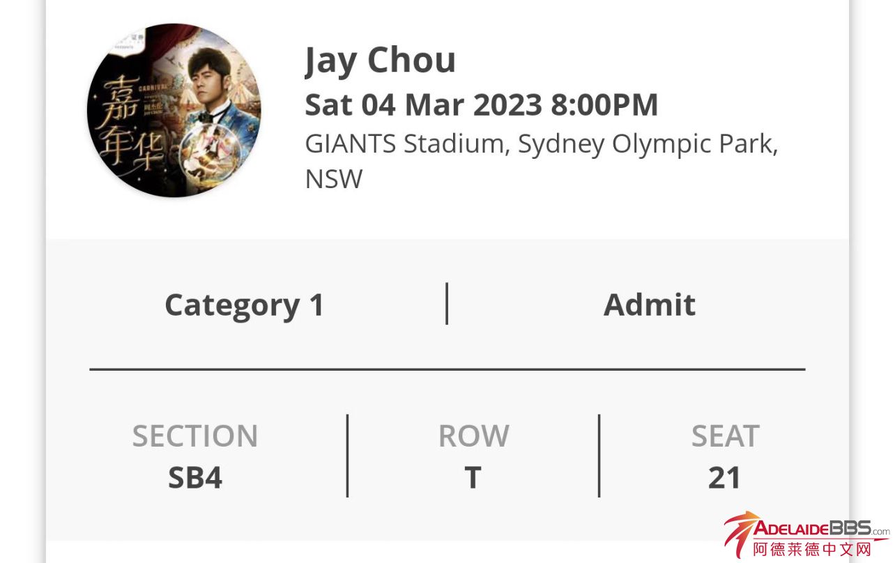 转三月四号周杰伦悉尼演唱会门票一张,B4 电话:0431438935