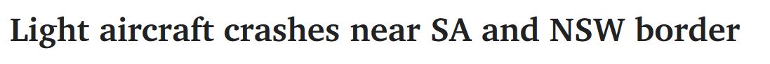 南澳边界轻型飞机坠毁! 一名飞行员驾驶的飞机在南澳和新州边界附近坠毁,目前驾驶员正在Royal Adelaide Hospital接受治疗。 这名47岁的飞行员来自Cockburn,伤势严重,但没有生命危险,已被送往皇家阿德莱 ...