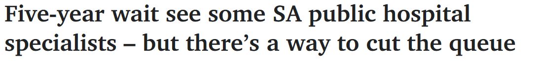 南澳的病人需要等待长达五年的时间才能挂上一些公立医院的的专家门诊,进行常规的、非紧急的会面--如果他们需要进行择期手术,则将进入到另一份候诊名单中。 最简单的方法是,如果有能力,就选择私立医院,如 ...