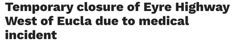 据悉,南澳公路运输协会(SARTA)就暂时关闭Eucla以西Eyre Highway一事发出紧急通知。 有关情况的进一步更新已经发布。RFDS飞机目前预计将于下午1:30降落在Eucla以西Eyre Highway。因此,高速公路的重新开放 ...