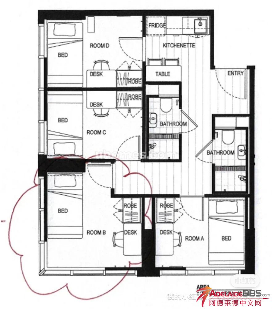 阿德莱德公寓市中心包 bill 300* 阿德莱德 adelaid city 转租 阿德莱德四人间转租 转租room D 4b 2b一共有两个厕所 房子布局如图还有半年租期,原价359*、现在300°。急转! 而且目前厕所暂时不用和人share因为有一 ...