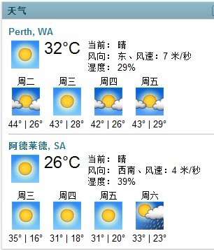 本帖最后由 daya 于 2012-1-25 00:29 编辑 这是Perth这一周的天气预报.... 今天白天 44度 ,现在晚上11点, 32度 明天43度 后天(国庆)42 星期五 43度... 相对来说,Adelaide简直是天堂啊!