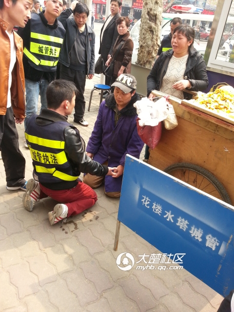 3月31日,武汉江汉区前进四路一推车小摊贩因占道经营被暂扣摊车。交涉时,小摊贩跪下说:“求求你把车子还给我吧! ”城管曹祥超见状也当即跪在了地上说:“有什么事可以站起来说,你跪着,我也只能陪你跪着。” ...