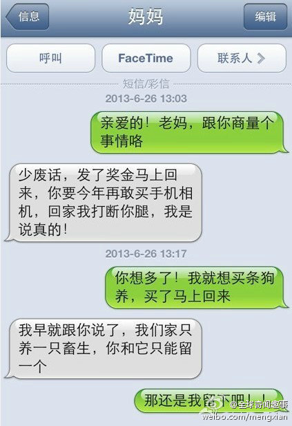 今天刚好发工资想买条松狮!发短信请示母后!结果!泪牛满面!我要离家出走!我一定不是亲生的!是充电话费送的么?