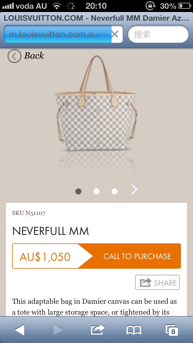 本帖最后由 nancy1987 于 2013-10-1 07:53 编辑 出售一款LVnervelful MM系列,白色棋格款的,购买于墨尔本,因小票丢失,顾特降价出售,可以人品保证包包绝对是正品,可面交看包,现在这款包卖1050,可我卖500, ...
