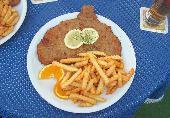 奥地利:维也纳炸肉排 维也纳炸肉排甚至可以作为奥地利的代名词。这种牛排,由切制而成的极薄的牛肉片先洒满面包屑,再深度油炸而成。它通常佐以柠檬和香菜,以及土豆或大米。