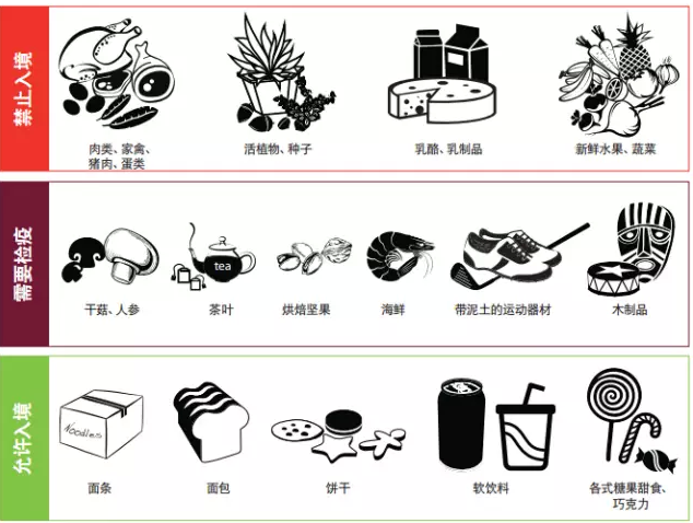 【面条和米饭】 包装膳食包括飞机上的食物﹑汤包 香草及香料(八角茴香﹑肉桂﹑丁香) 草药及传统药物﹑治疗﹑补药及香草茶(陈皮﹑菊花﹑树皮﹑灵芝﹑党参) 零食 (银杏﹑落花生﹑瓜子﹑肉松) 饼干﹑糕点及糖果(有猪肉的杏仁饼﹑威化饼﹑有猪肉的鸡仔饼﹑有香肠的糕饼是被禁的) 茶﹑咖啡和其他用牛奶冲调的饮饮品(三合一咖啡﹑茶和美碌)