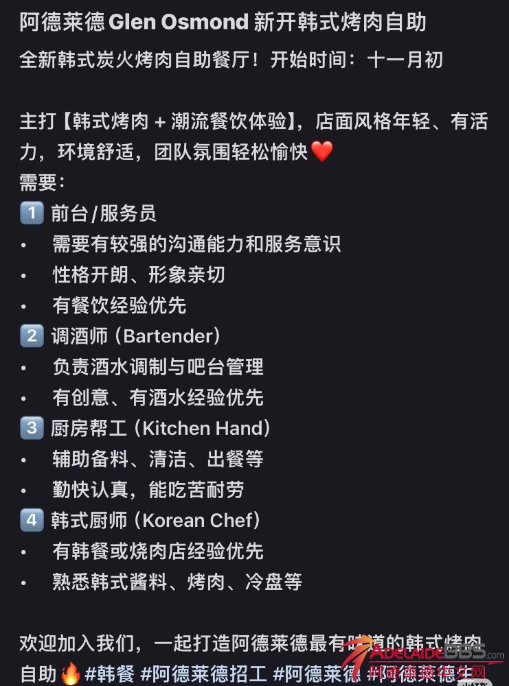 Glen Osmond 新开业韩式烧烤店招聘 短信联 ...