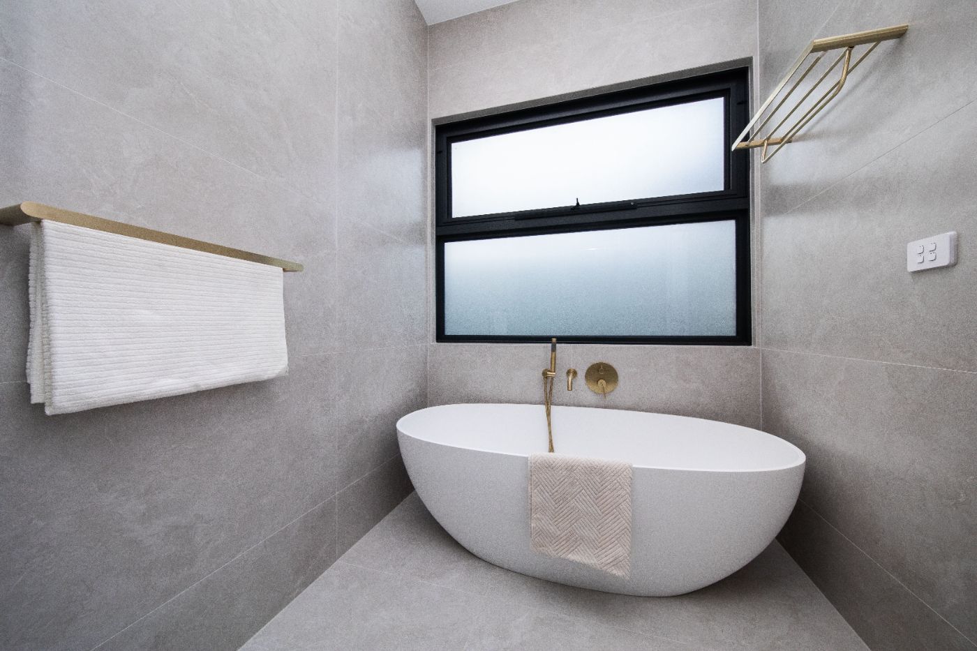 主浴室配置 实心工程石材独立浴缸 + 隐藏式水箱马桶