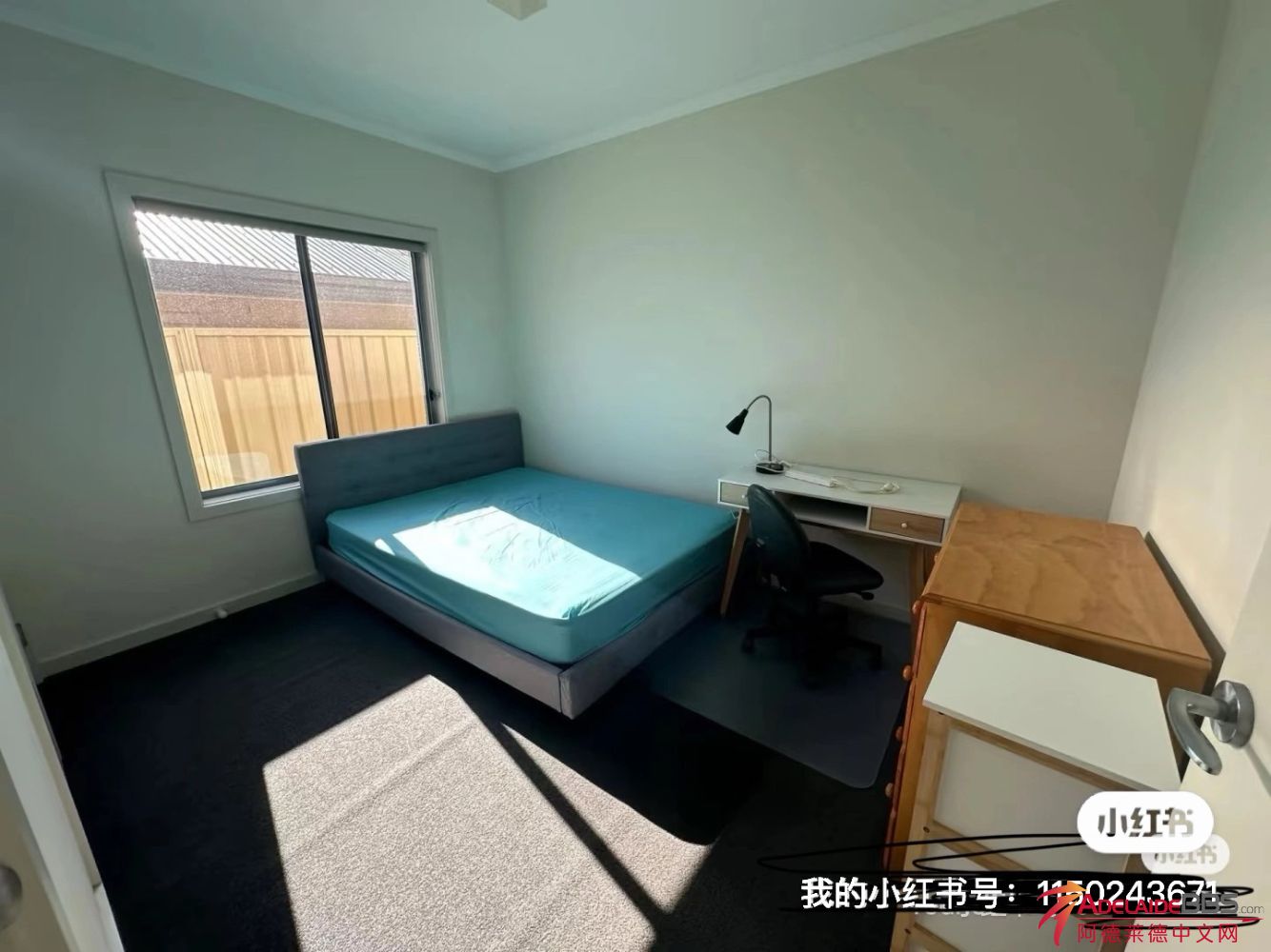 房间采光很好也很宽敞,有内置衣柜,double size的床,书桌,都是新的7 c& f8 Q' U1 ]8 B6 _/ E8 E