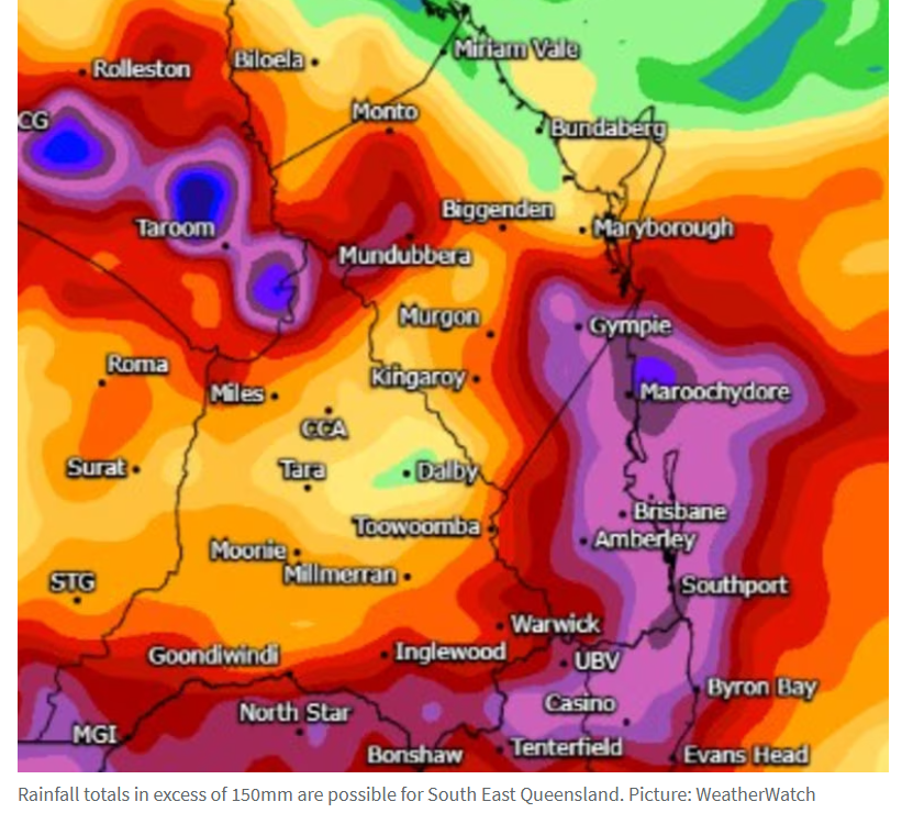 Gatton、Ipswich、Kenmore、Nerang、Caboolture、Emerald、Injune和Surat可能高达115毫米,而Boonah、Laidley、Oxley、Miles、Springsure、Taroom和Roma可能记录到高达110毫米的降雨。