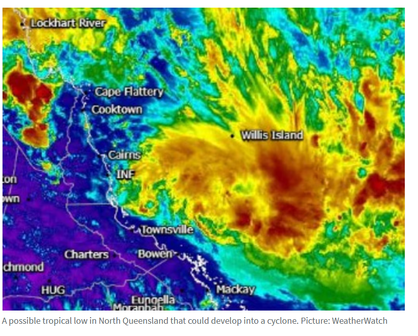 在强降雨来临之际,澳大利亚气象局持续监测一个热带低气压在Coral Sea上空发展成气旋的潜在可能,该低气压很可能被命名为Tropical Low 23U。