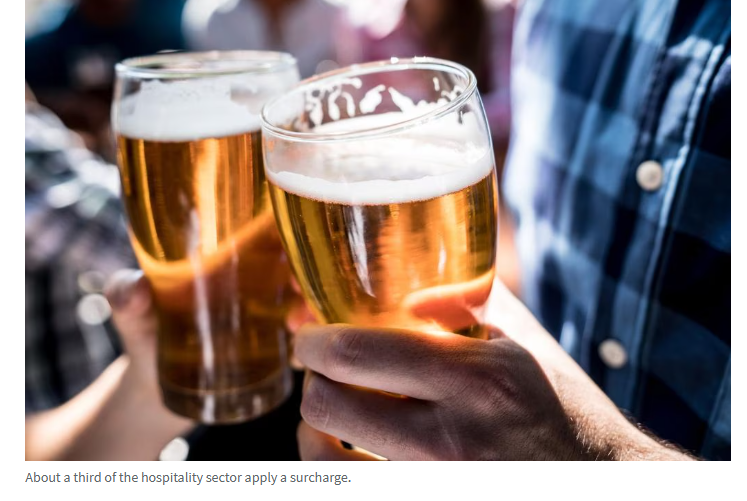 目前约有16%的商家会收取附加费,在餐饮住宿行业这一比例约为三分之一。