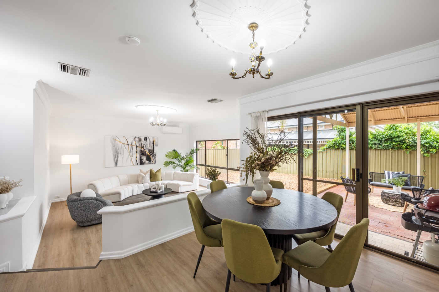 宽敞的错层客厅和餐厅区采光充足,大窗户和滑动门直通后花园,无论是日常家庭生活还是招待宾客都非常理想。